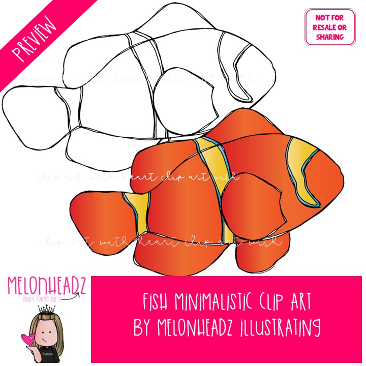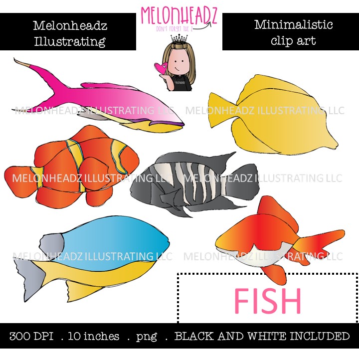 Fish clip art, Minimal Style Mini: This illustrated set contains all of the clip art images as shown in the preview picture. COLORED and BLACK AND WHITE illustrations included.