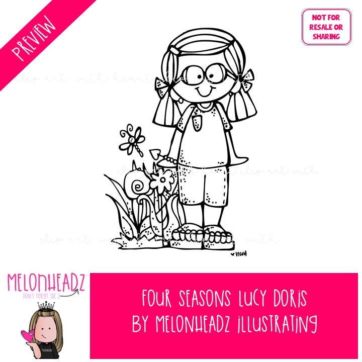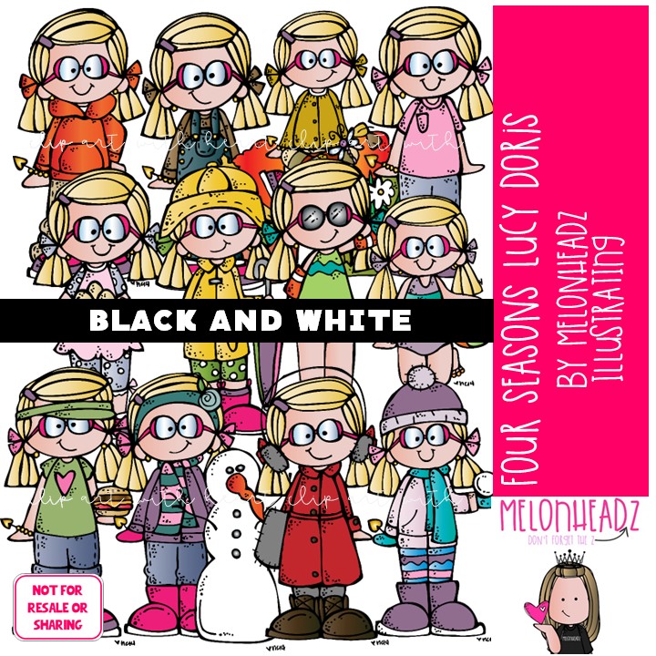 Four Seasons clip art, Lucy Doris, Melonheadz Characters BLACK AND WHITE: This illustrated set contains all of the clip art images as shown in the preview picture. BLACK AND WHITE illustrations included.
