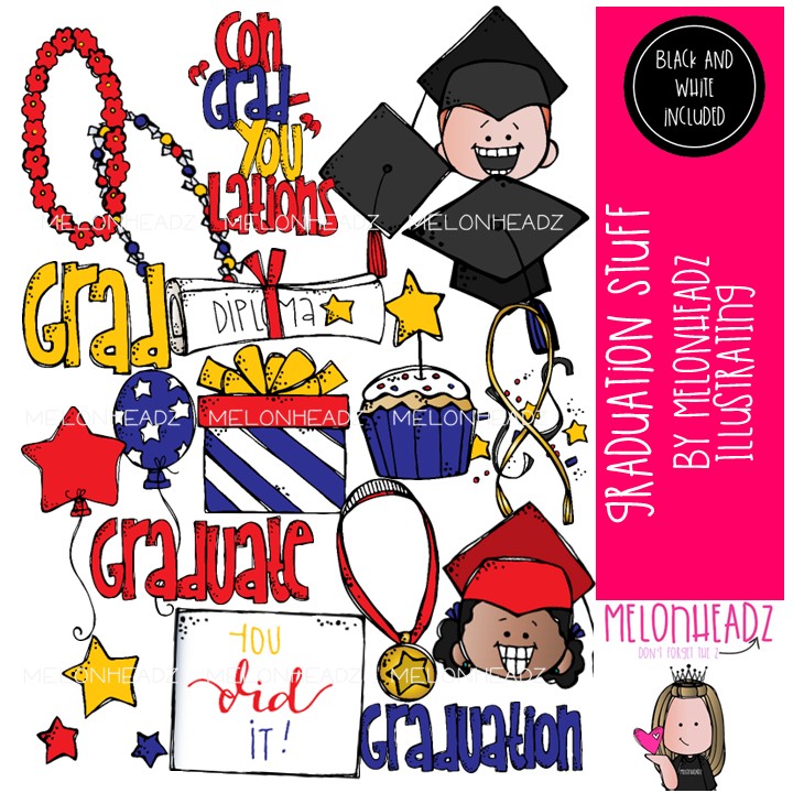 Graduation clip art Commencement clip art COMBO PACK: This illustrated set contains all of the clip art images as shown in the preview picture. COLORED and BLACK AND WHITE  illustrations included.