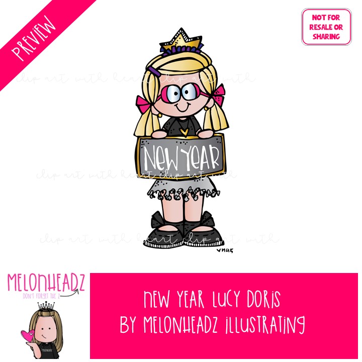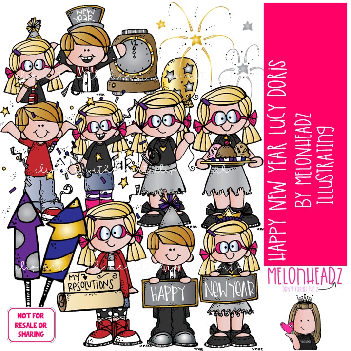 New Year clip art, Lucy Doris clip art, Melonheadz Character COLORED Version: This illustrated set contains all of the clip art images as shown in the preview picture. COLORED illustrations included.