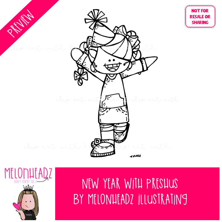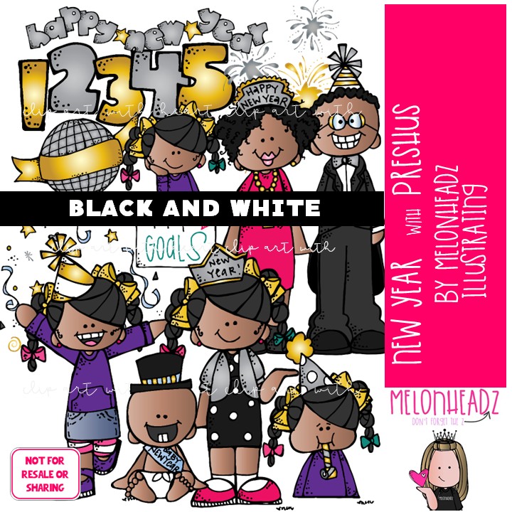 New Year clip art, Preshus clip art, Melonheadz Characters clip art BLACK AND WHITE: This illustrated set contains all of the clip art images as shown in the preview picture. BLACK AND WHITE illustrations included.