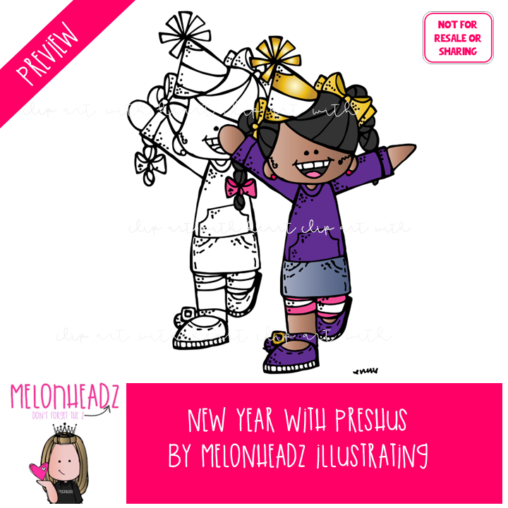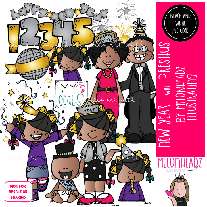 New Year clip art, Preshus clip art, Melonheadz Character clip art COMBO PACK: This illustrated set contains all of the clip art images as shown in the preview picture. COLORED and BLACK AND WHITE illustrations included.
