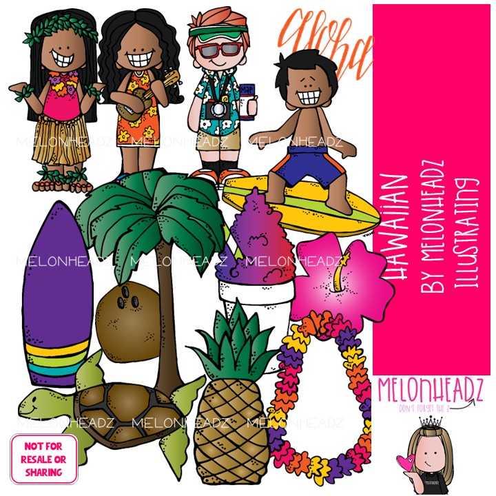Hawaiian clip art, beach, surf COLORED Version: This illustrated set contains all of the clip art images as shown in the preview picture. COLORED illustrations included.