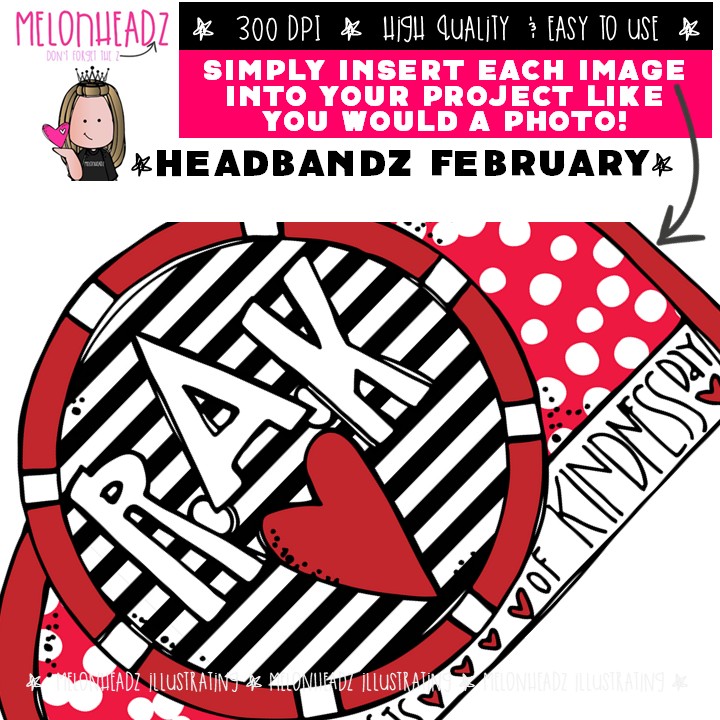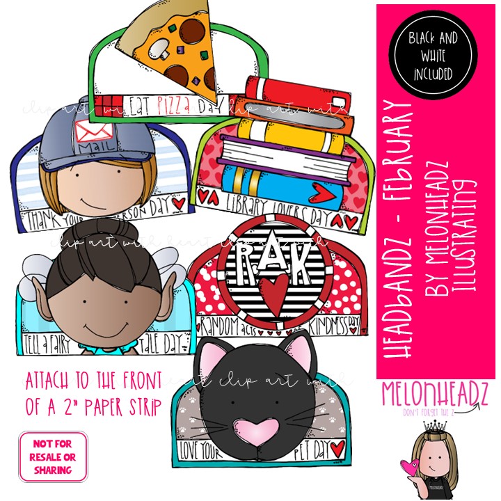 Headbandz clip art, February holidays, toppers COMBO PACK: This illustrated set contains all of the clip art images as shown in the preview picture. COLORED and BLACK AND WHITE illustrations included.