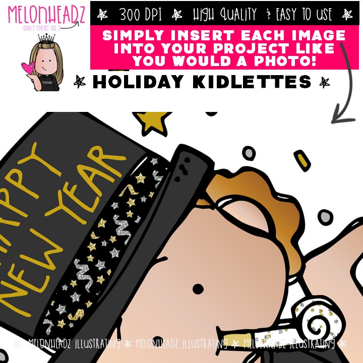Holiday kidlettes clip art, costume clip art, birthday clip art COLORED Version: This illustrated set contains all of the clip art images as shown in the preview picture. COLORED illustrations only.