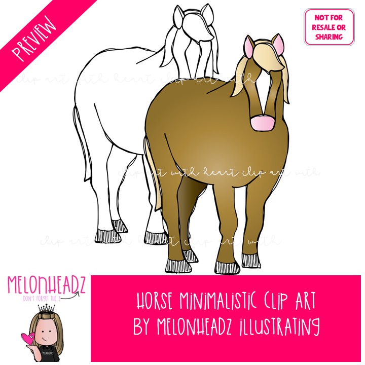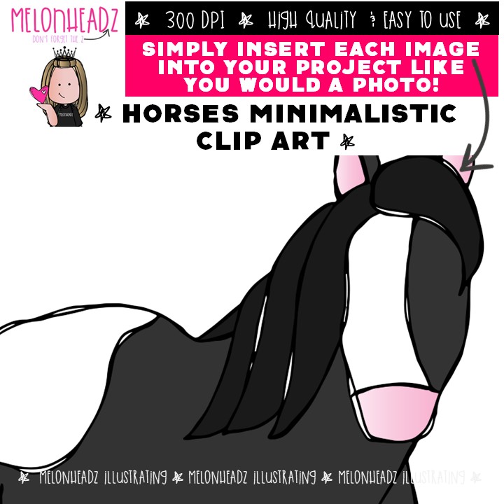 Horses clip art, Minimal Style Mini: This illustrated set contains all of the clip art images as shown in the preview picture. COLORED and BLACK AND WHITE illustrations included.
