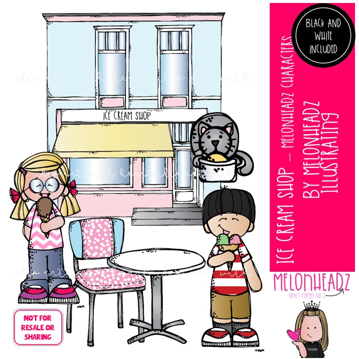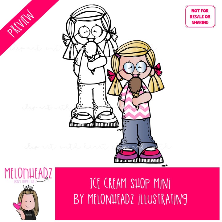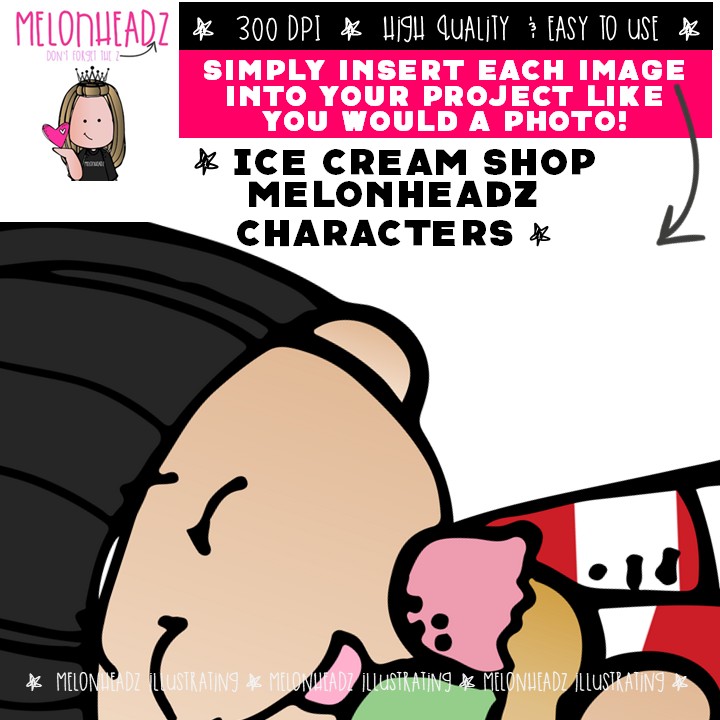 Ice Cream Shop clip art, Melonheadz Characters Mini: This illustrated set contains all of the clip art images as shown in the preview picture. COLORED and BLACK AND WHITE illustrations included.