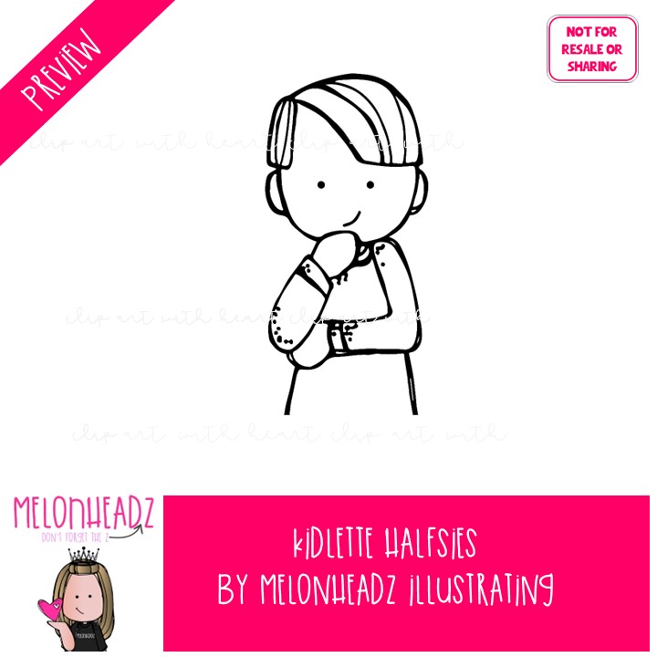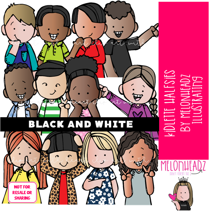 Kidlette Halfsies clip art, kid clip art, topper clip art BLACK AND WHITE: This illustrated set contains all of the clip art images as shown in the preview picture. BLACK AND WHITE illustrations only.