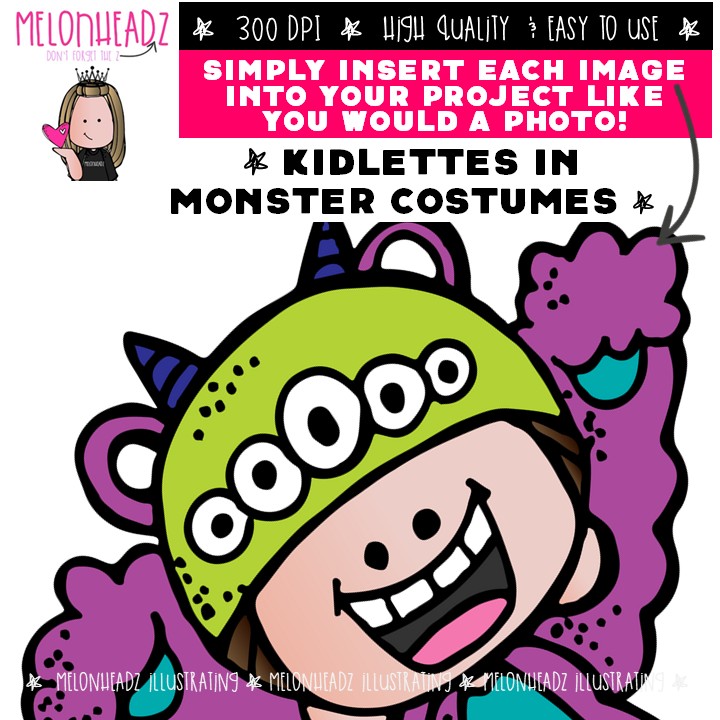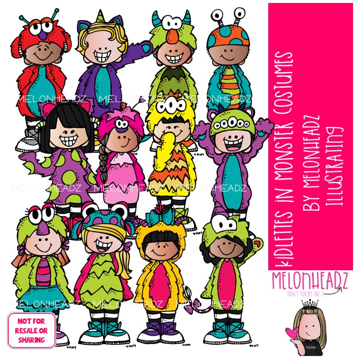 Kidlettes in Monster Costumes clip art, Halloween clip art, Monster clip art COLORED Version: This illustrated set contains all of the clip art images as shown in the preview picture. COLORED illustrations included.