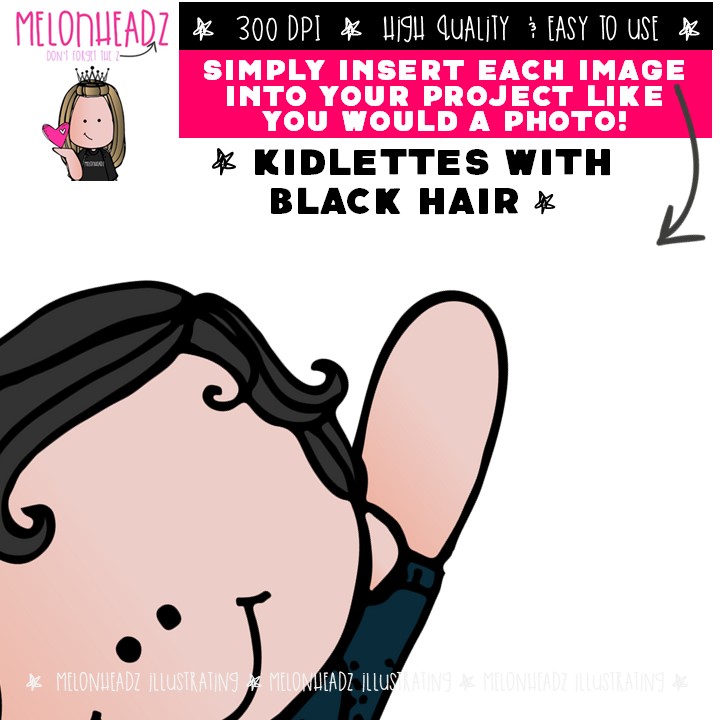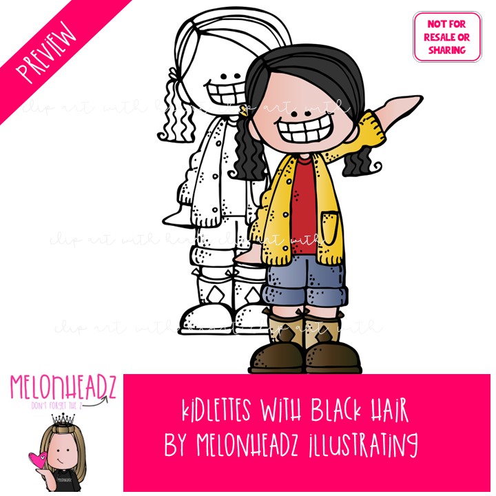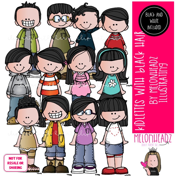 Kidlettes with black hair clip art, Kids clip art COMBO PACK: This illustrated set contains all of the clip art images as shown in the preview picture. COLORED and BLACK AND WHITE illustrations included.