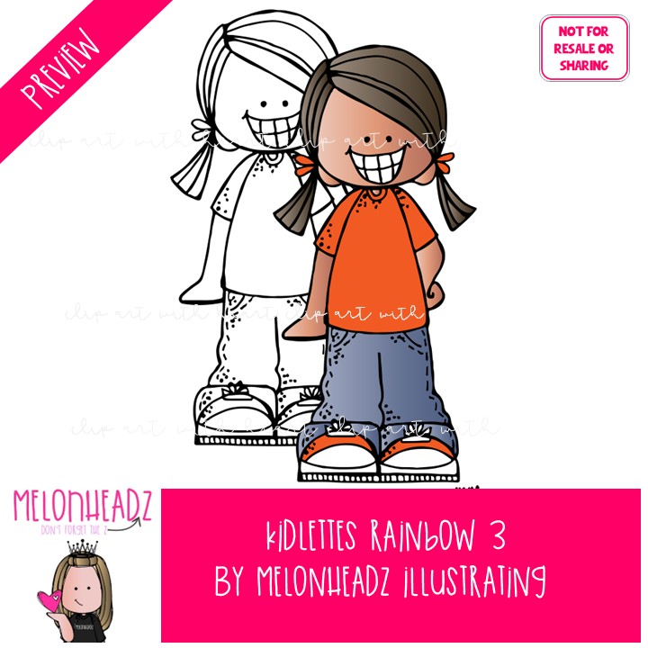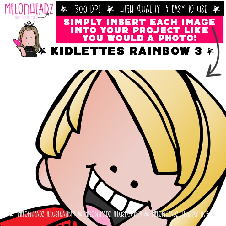 Kidlettes in Rainbow colors clip art 3 COMBO PACK: This illustrated set contains all of the clip art images as shown in the preview picture. COLORED and BLACK AND WHITE illustrations included.