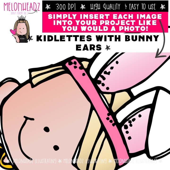 Kidlettes clip art, Bunny Ears, Easter Mini: This illustrated set contains all of the clip art images as shown in the preview picture. COLORED and BLACK AND WHITE illustrations included.