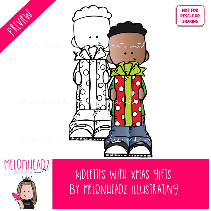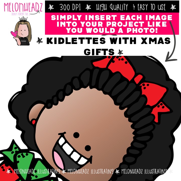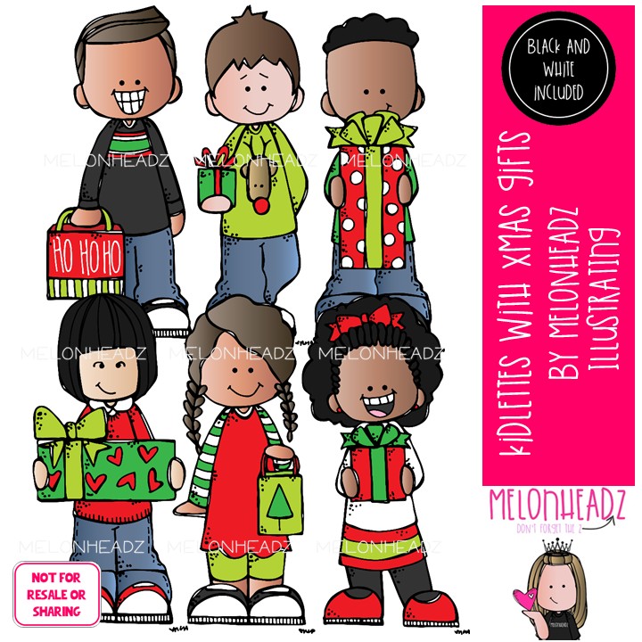Kidlettes with Xmas gifts clip art, Christmas clip art Mini: This illustrated set contains all of the clip art images as shown in the preview picture. COLORED and BLACK AND WHITE illustrations included.