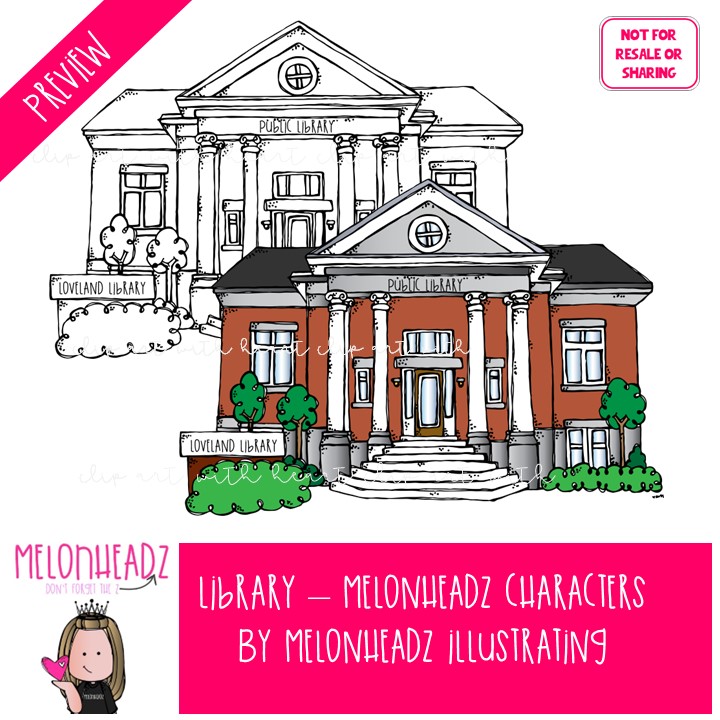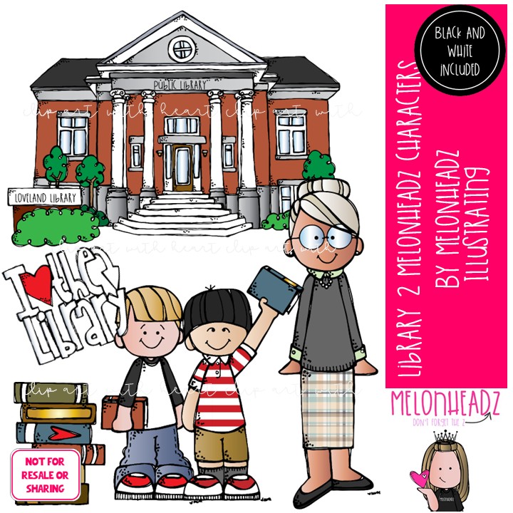 Library clip art 2, Melonheadz Characters, librarian Mini: This illustrated set contains all of the clip art images as shown in the preview picture. COLORED and BLACK AND WHITE illustrations included.