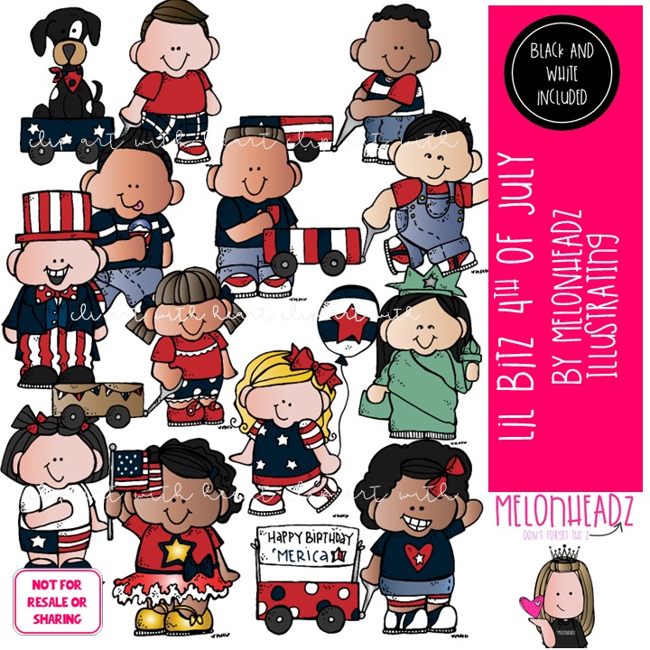 4th of July clip art Independence Day clip art Lil Bitz clip art COMBO PACK Version: This illustrated set contains all of the clip art images as shown in the preview picture. COLORED and BLACK AND WHITE illustrations included.