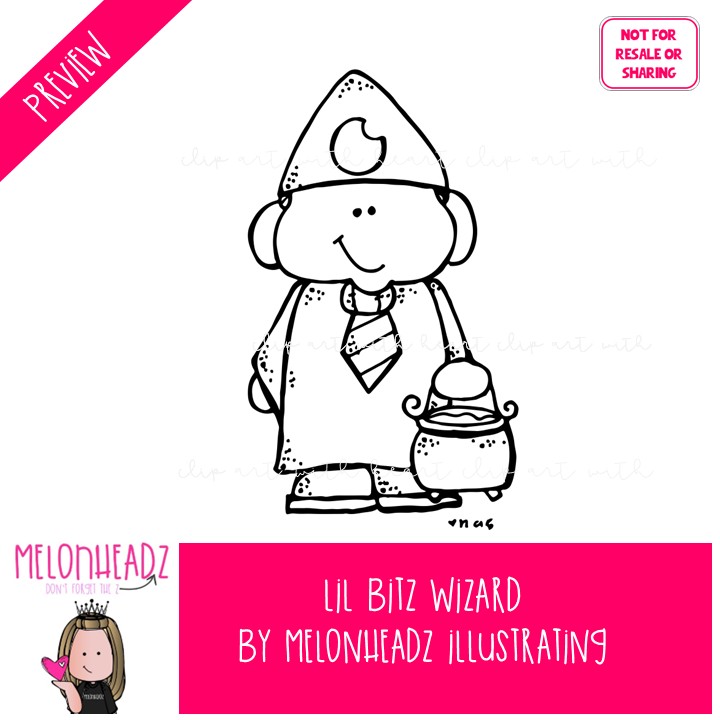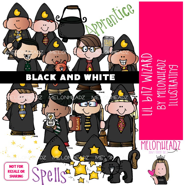 Lil Bitz clip art, wizard, witch BLACK AND WHITE: This illustrated set contains all of the clip art images as shown in the preview picture. BLACK AND WHITE illustrations included.