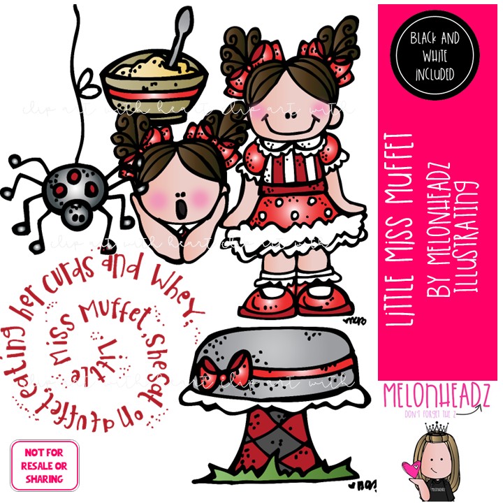 Little Miss Muffet clip art, Nursery Rhyme clip art, Literature clip art Mini: This illustrated set contains all of the clip art images as shown in the preview picture. COLORED and BLACK AND WHITE illustrations included.