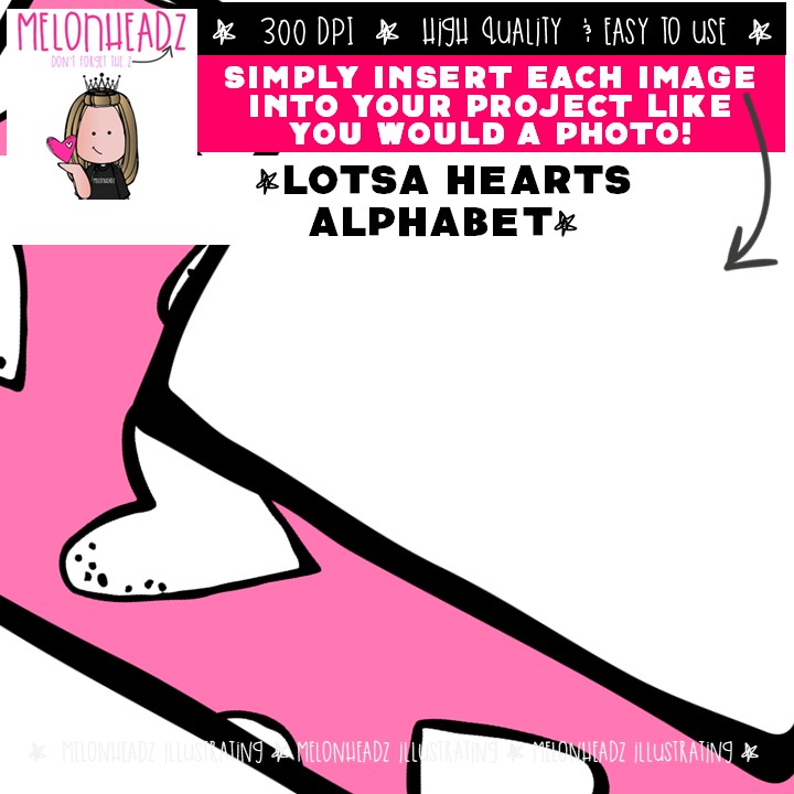 Lotsa Hearts clip art, Alphabet clip art COLORED Version: This illustrated set contains all of the clip art images as shown in the preview picture. COLORED and BLACK AND WHITE illustrations included.