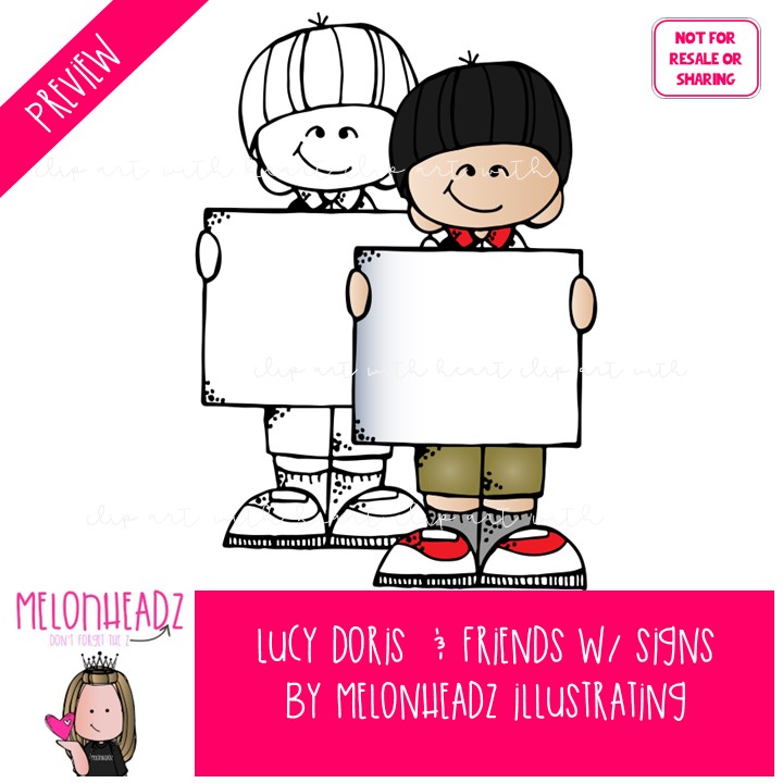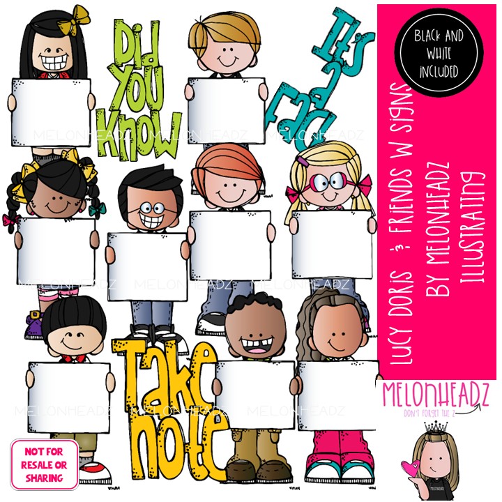 Lucy Doris and Friends with signs, blank, Melonheadz Character COMBO PACK: This illustrated set contains all of the clip art images as shown in the preview picture. COLORED and BLACK AND WHITE illustrations included.