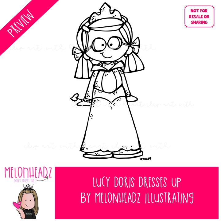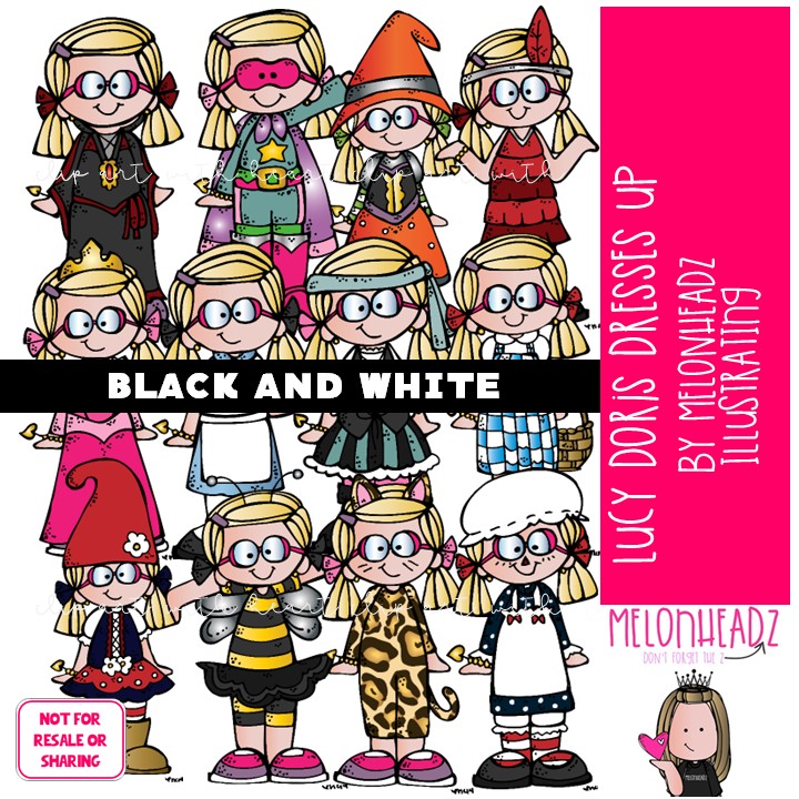 Lucy Doris Dresses up clip art, Halloween, Melonheadz Character BLACK AND WHITE: This illustrated set contains all of the clip art images as shown in the preview picture. BLACK AND WHITE illustrations included.