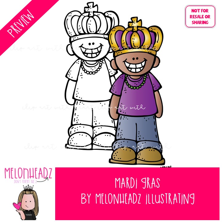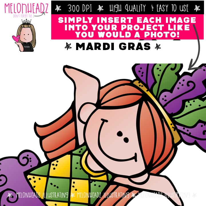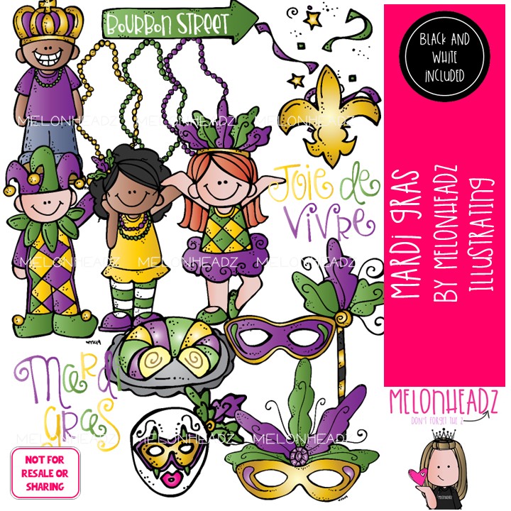 Mardi Gras clip art, party COMBO PACK: This illustrated set contains all of the clip art images as shown in the preview picture. COLORED and BLACK AND WHITE illustrations included.