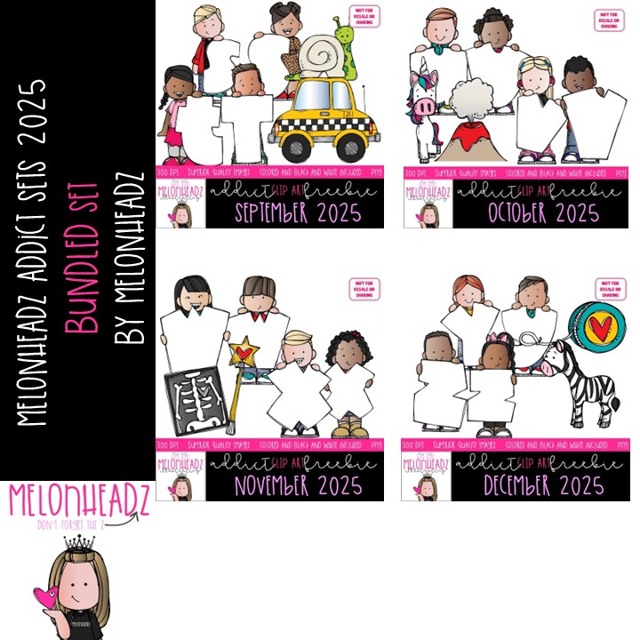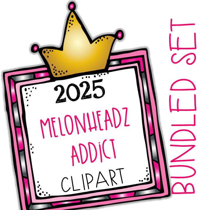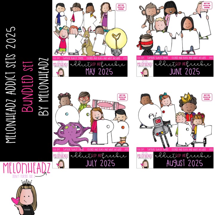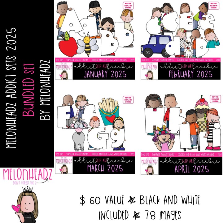 Melonheadz Addict clip art 2025, Alphabet BUNDLED MINIS: This illustrated set contains all of the clip art images as shown in the preview picture. COLORED and BLACK AND WHITE illustrations included.