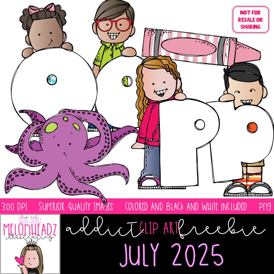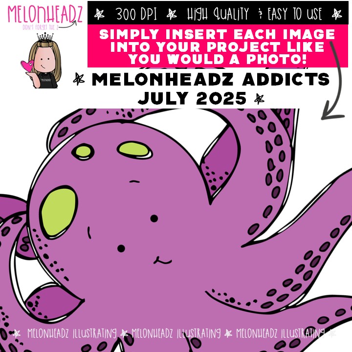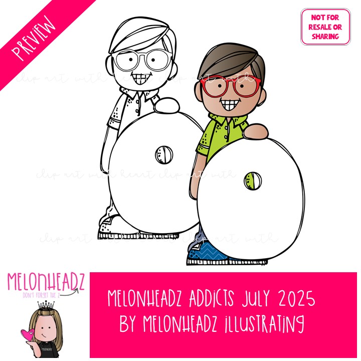 Melonheadz Addicts July 2025 clip art, Alphabet Mini: This illustrated set contains all of the clip art images as shown in the preview picture. COLORED and BLACK AND WHITE illustrations included.