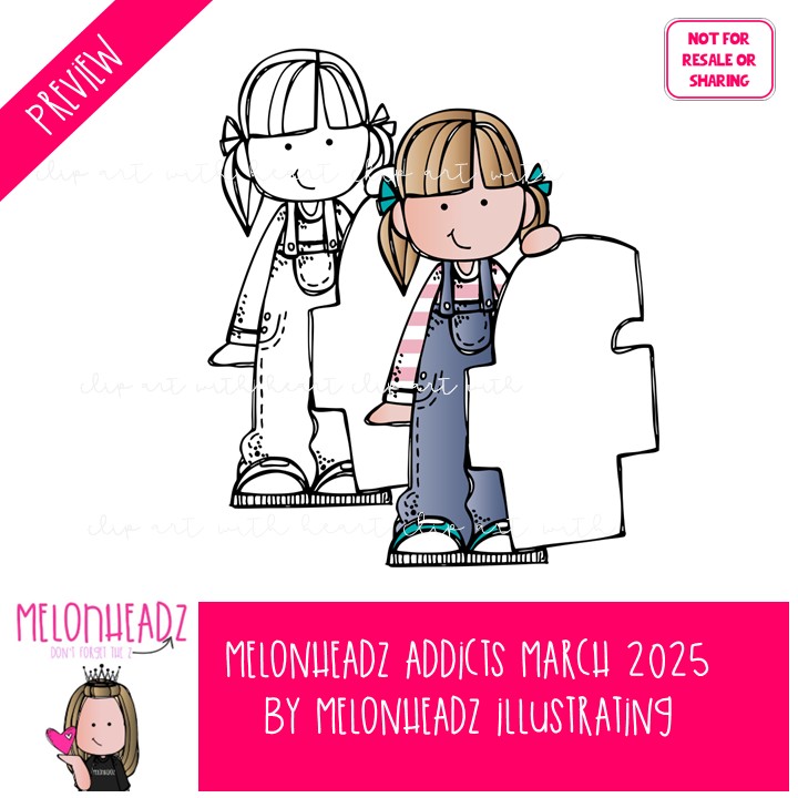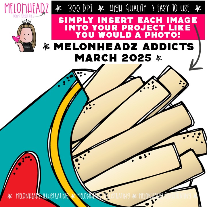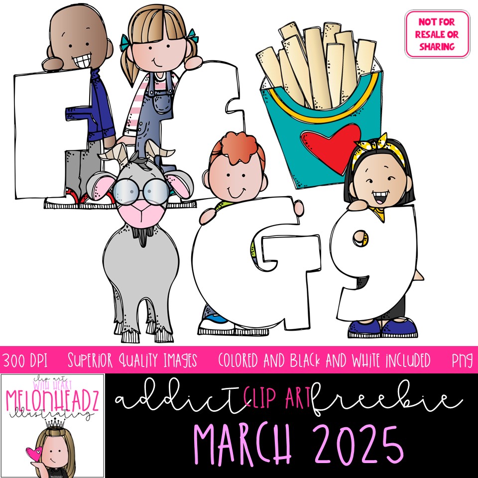 Melonheadz Addicts March 2025 clip art, Alphabet Mini: This illustrated set contains all of the clip art images as shown in the preview picture. COLORED and BLACK AND WHITE illustrations included.