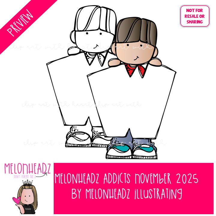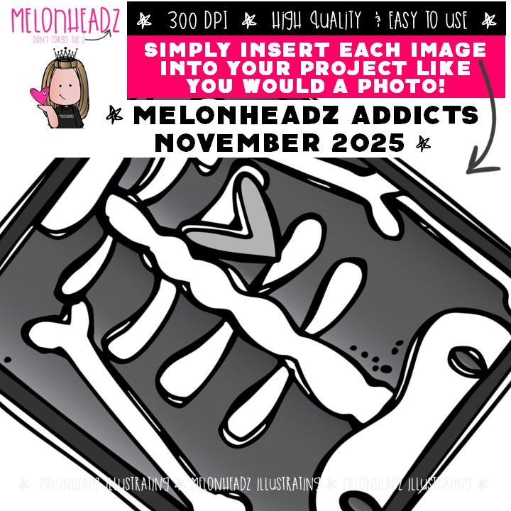 Melonheadz Addicts November 2025 clip art, Alphabet Mini: This illustrated set contains all of the clip art images as shown in the preview picture. COLORED and BLACK AND WHITE illustrations included.