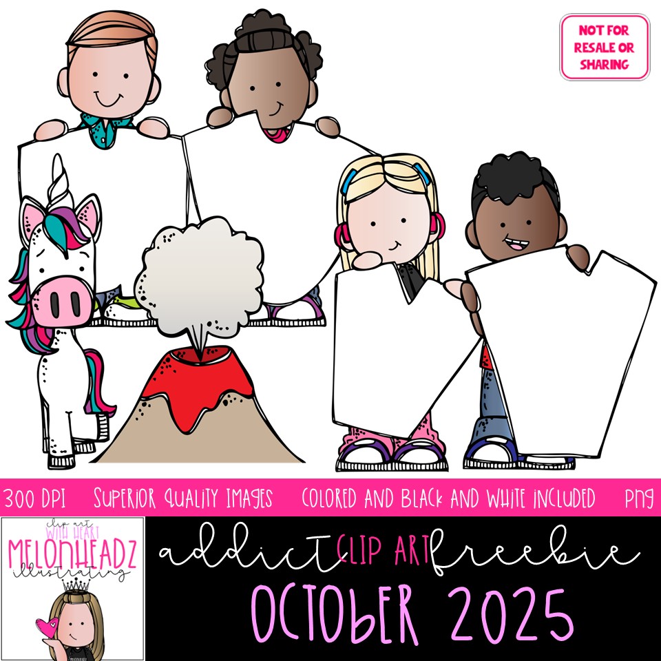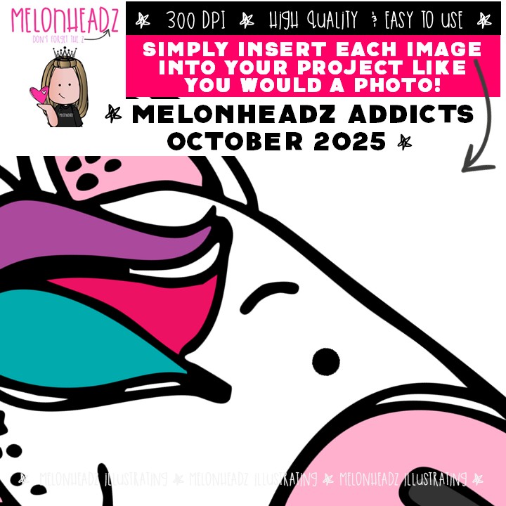 Melonheadz Addicts October 2025 clip art, Alphabet Mini: This illustrated set contains all of the clip art images as shown in the preview picture. COLORED and BLACK AND WHITE illustrations included.