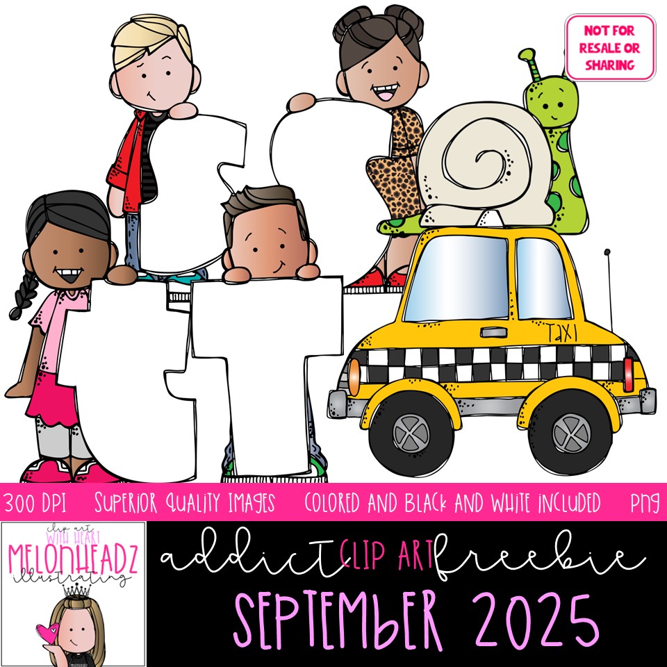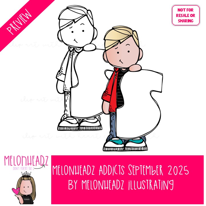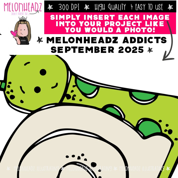 Melonheadz Addicts September 2025 clip art, Alphabet Mini: This illustrated set contains all of the clip art images as shown in the preview picture. COLORED and BLACK AND WHITE illustrations included.