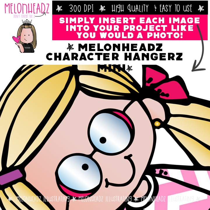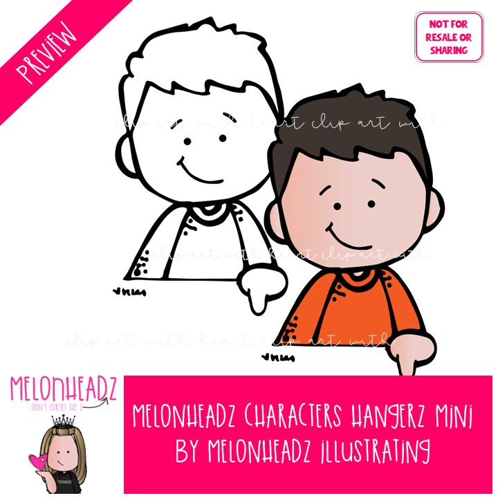 Melonheadz Character clip art, Hangerz, Toppers Mini: This illustrated set contains all of the clip art images as shown in the preview picture. COLORED and BLACK AND WHITE illustrations included.