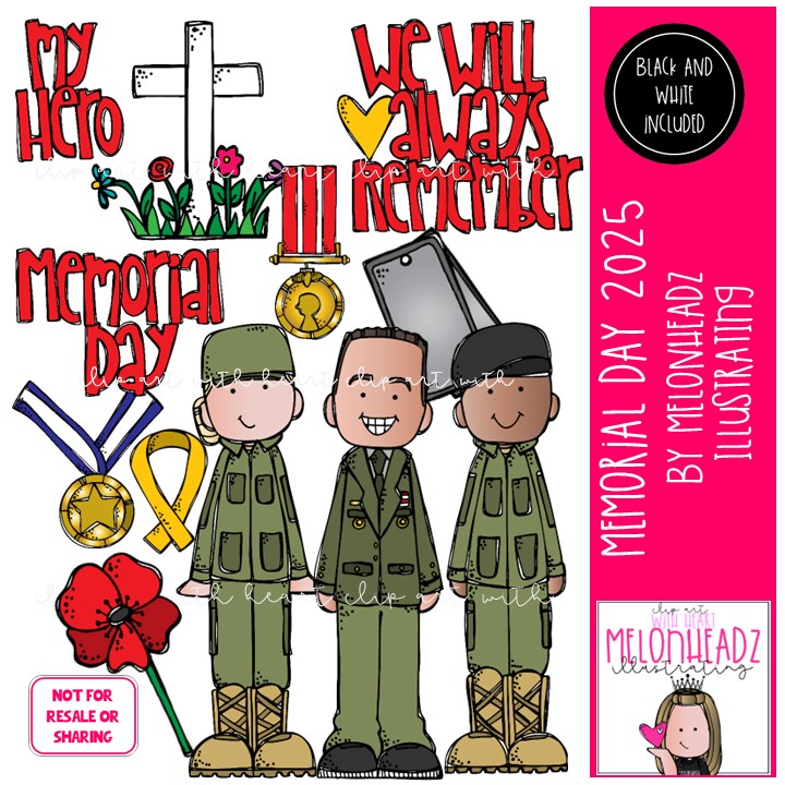 Memorial Day clip art 2025 Military clip art Veterans Day clip art COMBO PACK: This illustrated set contains all of the clip art images as shown in the preview picture. COLORED and BLACK AND WHITE illustrations included.