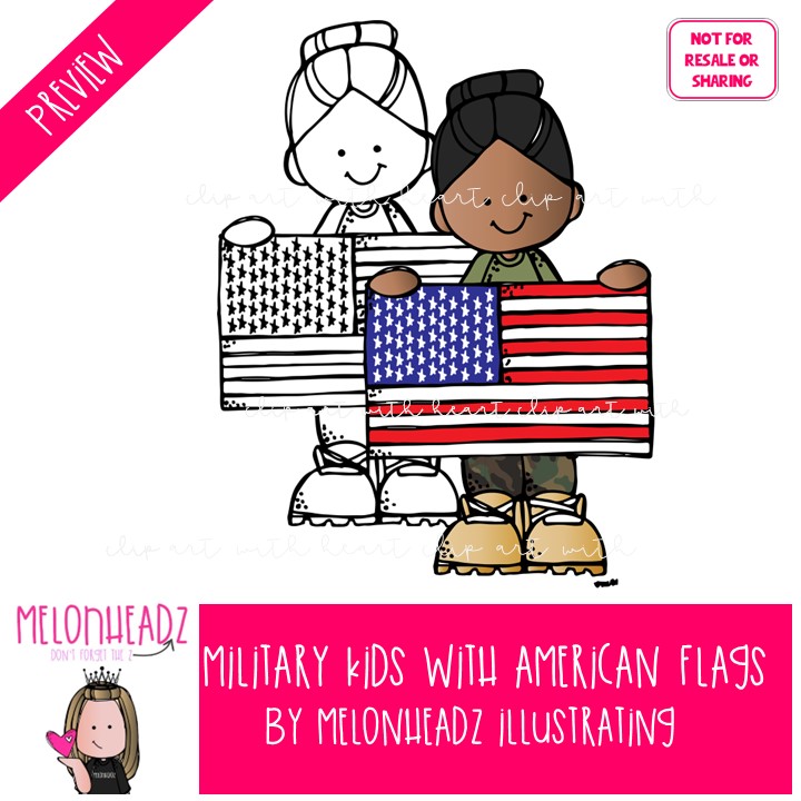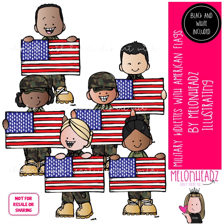 Military Kidlettes with American Flags clip art 4th of July clip art Mini: This illustrated set contains all of the clip art images as shown in the preview picture. COLORED  and BLACK AND WHITE illustrations included.