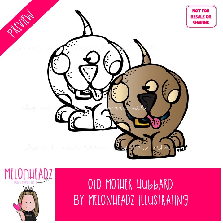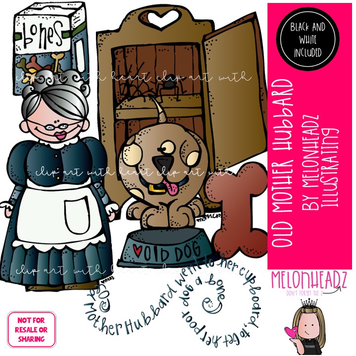 Old Mother Hubbard clip art, Nursery Rhyme clip art, Literature clip art Mini: This illustrated set contains all of the clip art images as shown in the preview picture. COLORED and BLACK AND WHITE illustrations included.
