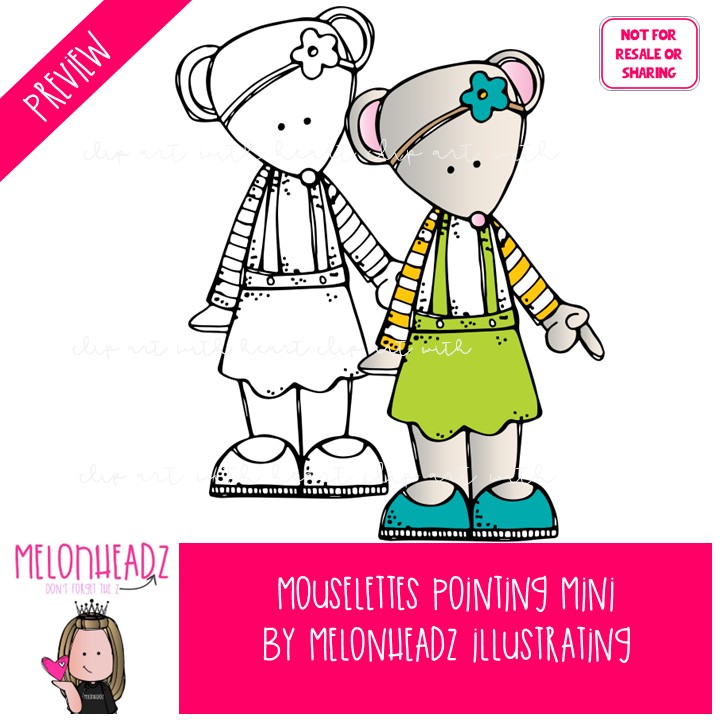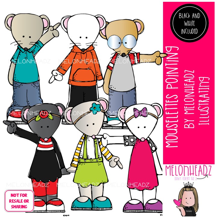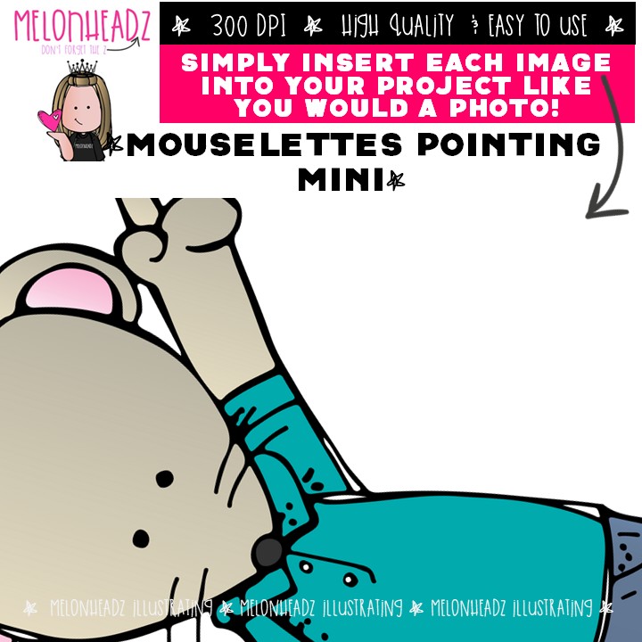 Mouselettes clip art, pointing Mini: This illustrated set contains all of the clip art images as shown in the preview picture. COLORED and BLACK AND WHITE illustrations included.
