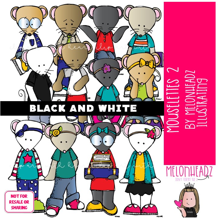 Mouselettes 2 clip art BLACK AND WHITE: This illustrated set contains all of the clip art images as shown in the preview picture. BLACK AND WHITE illustrations included.
