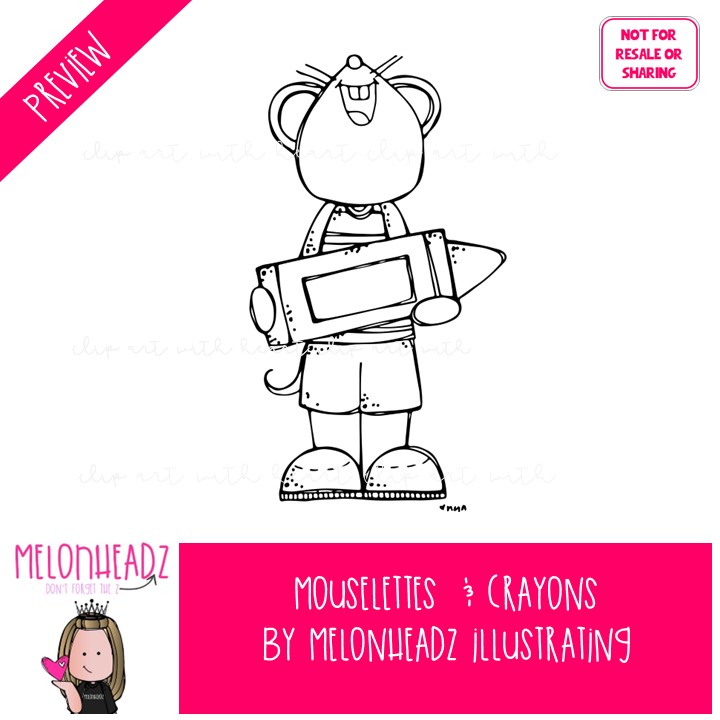 Mouselettes clip art, with Crayons BLACK AND WHITE: This illustrated set contains all of the clip art images as shown in the preview picture. BLACK AND WHITE illustrations included.