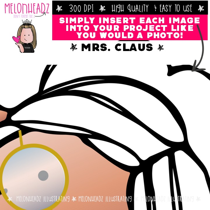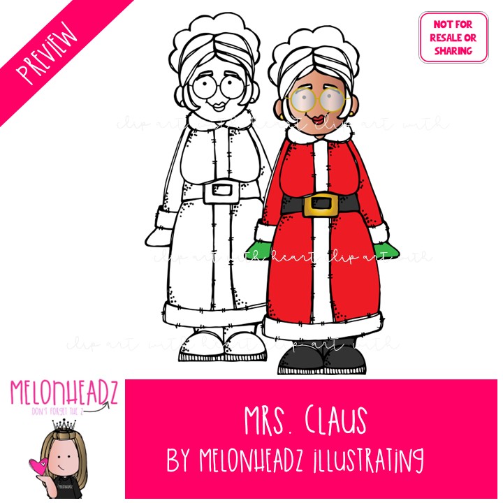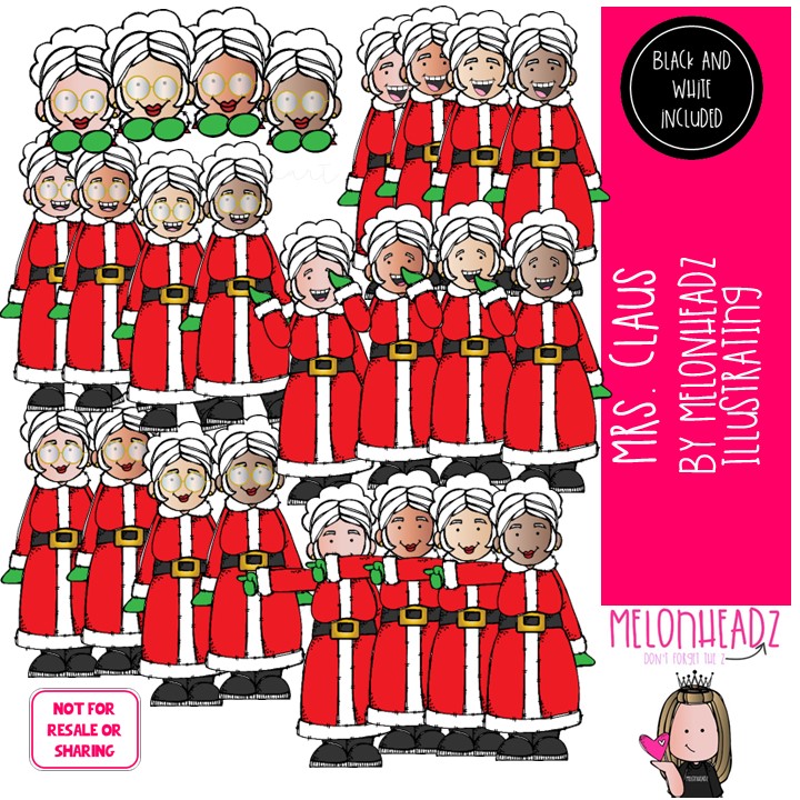 Mrs. Claus clip art, Christmas clip art COMBO PACK: This illustrated set contains all of the clip art images as shown in the preview picture. COLORED and BLACK AND WHITE illustrations included.