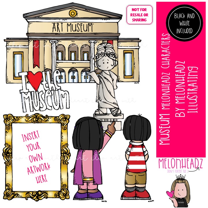 Museum clip art, Melonheadz Characters, statue Mini: This illustrated set contains all of the clip art images as shown in the preview picture. COLORED and BLACK AND WHITE illustrations included.