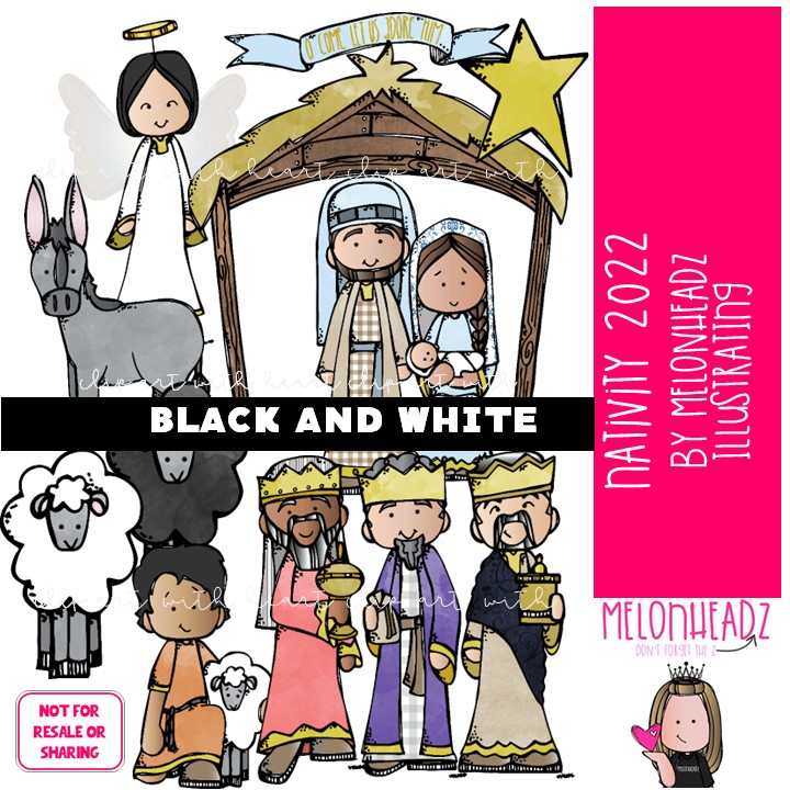Nativity clip art 2022, Christmas clip art BLACK AND WHITE: This illustrated set contains all of the clip art images as shown in the preview picture. BLACK AND WHITE illustrations included.