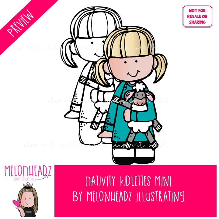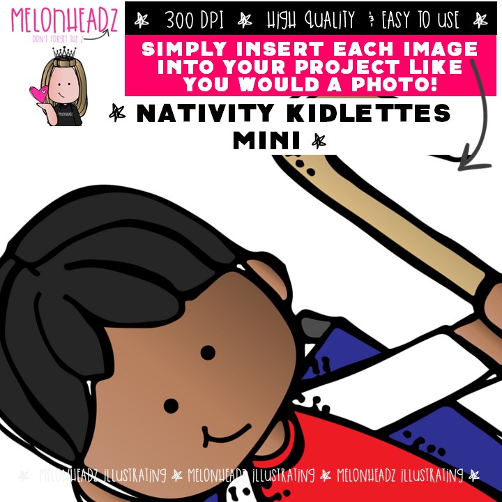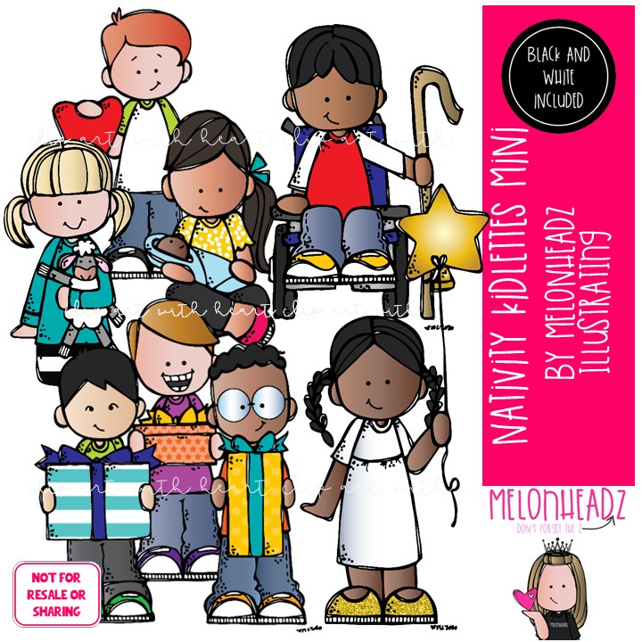 Nativity Kidlettes clip art, Christmas clip art Mini: This illustrated set contains all of the clip art images as shown in the preview picture. COLORED and BLACK AND WHITE illustrations included.