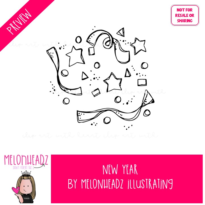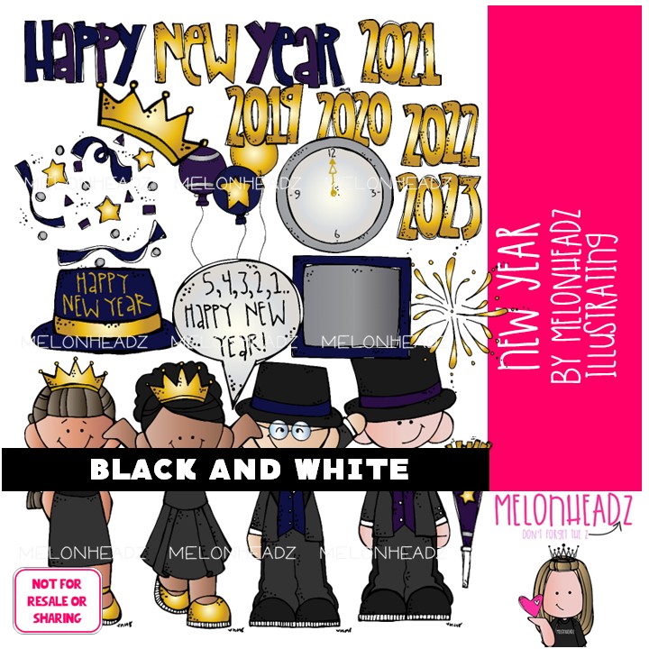 New Year clip art, holiday clip art BLACK AND WHITE: This illustrated set contains all of the clip art images as shown in the preview picture. BLACK AND WHITE illustrations included.