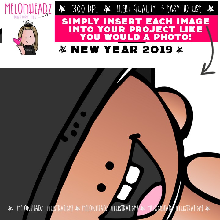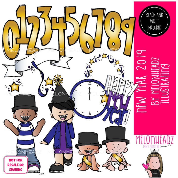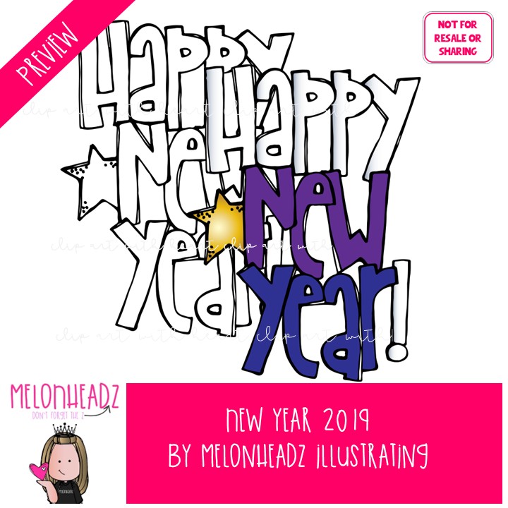 New Year clip art 2019, holiday clip art COMBO PACK: This illustrated set contains all of the clip art images as shown in the preview picture. COLORED and BLACK AND WHITE illustrations included.