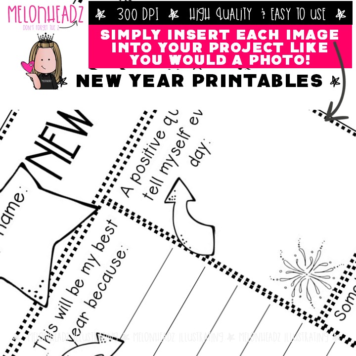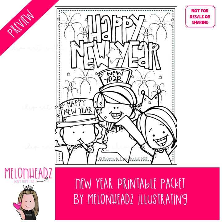 New Year Printable Packet, Coloring Page, Word Search: This illustrated set contains all of the clip art images as shown in the preview picture. Â BLACK AND WHITE illustrations included.