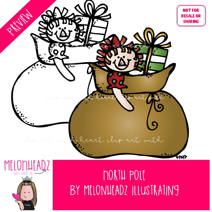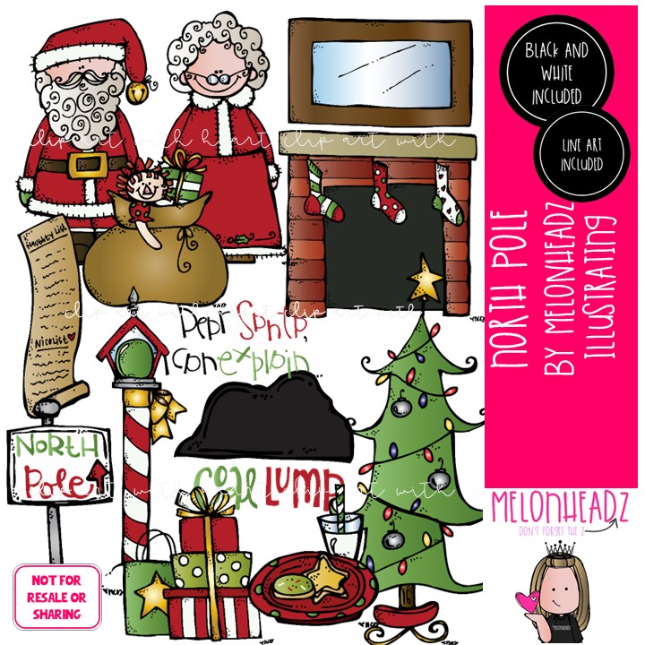 North Pole clip art, Christmas clip art, Santa clip art COMBO PACK: This illustrated set contains all of the clip art images as shown in the preview picture. COLORED, BLACK AND WHITE, and LINE ART illustrations included.