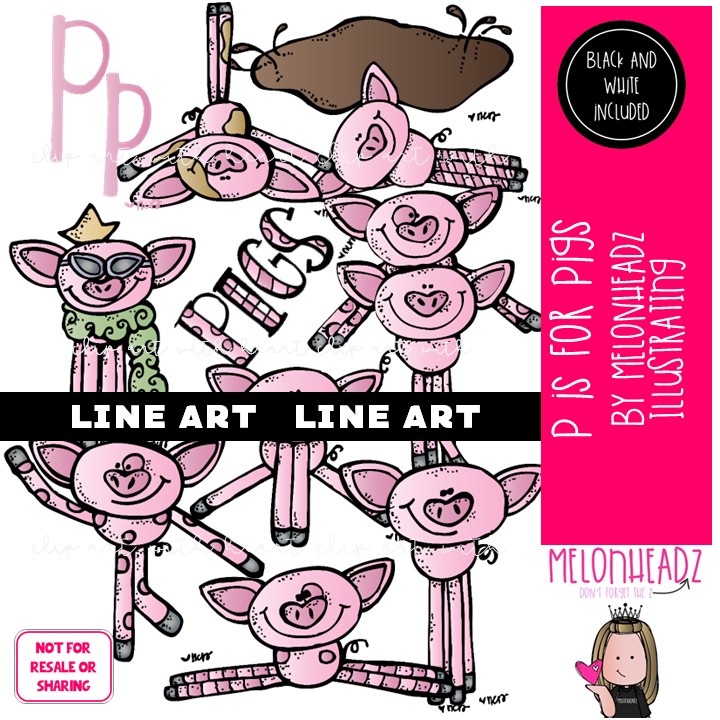 P is for pigs clip art LINE ART and BLACK AND WHITE: This illustrated set contains all of the clip art images as shown in the preview picture.  BLACK AND WHITE and LINE ART  illustrations included.