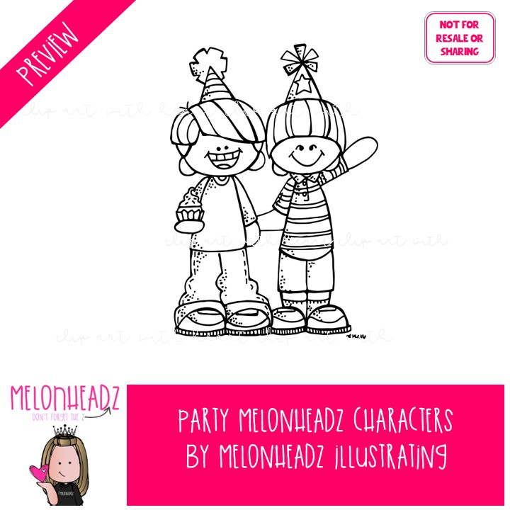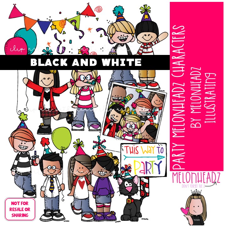 Party clip art, Melonheadz Characters, birthday BLACK AND WHITE: This illustrated set contains all of the clip art images as shown in the preview picture. BLACK AND WHITE illustrations included.