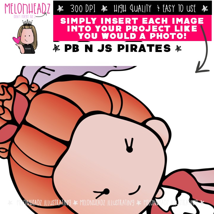 PB n Js clip art, Pirates Mini: This illustrated set contains all of the clip art images as shown in the preview picture. COLORED and BLACK AND WHITE illustrations included.
