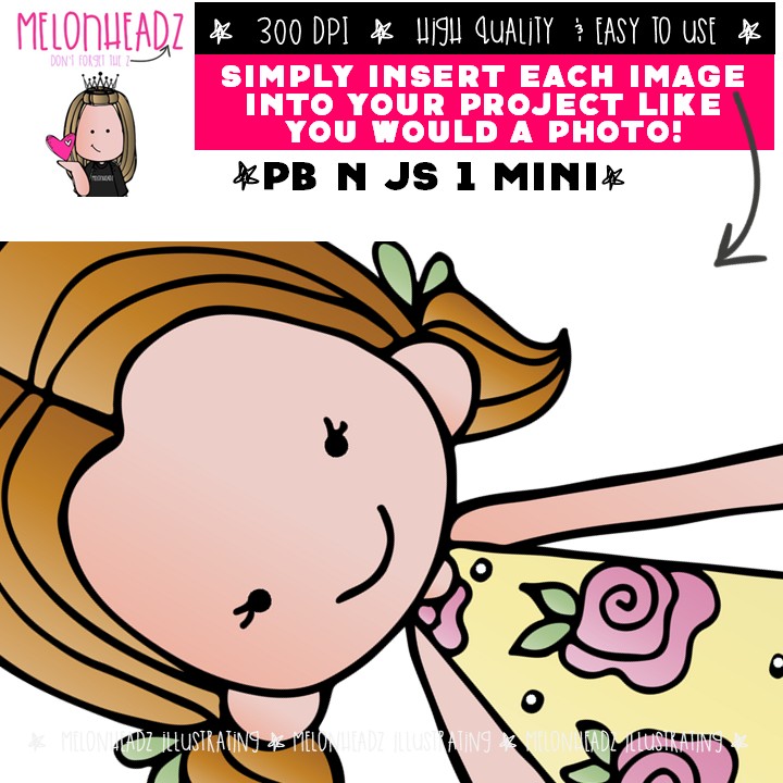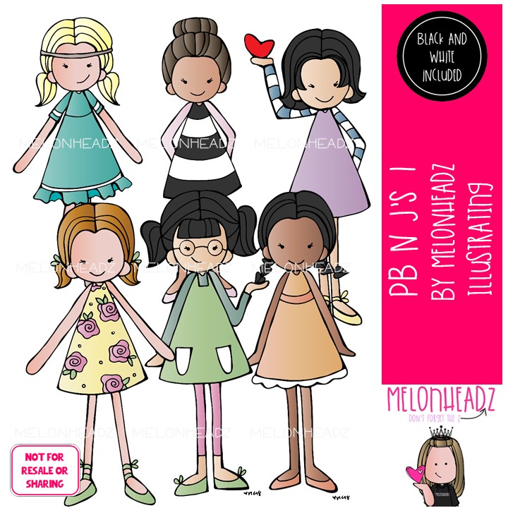 PB n Js’ clip art 1, girls Mini: This illustrated set contains all of the clip art images as shown in the preview picture. COLORED and BLACK AND WHITE illustrations included.